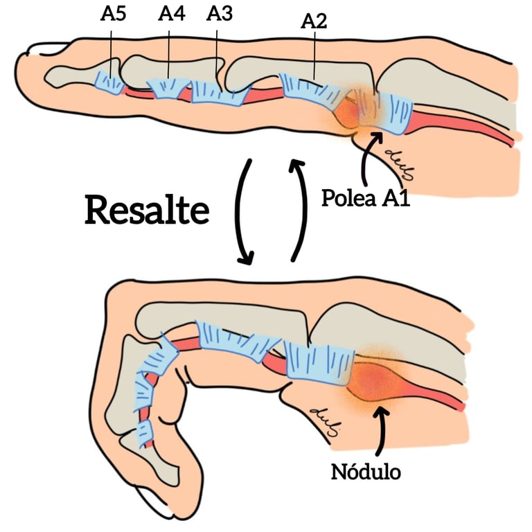 El dedo en resorte se produce por un engrosamiento del tendón flexor o de la polea que lo rodea, lo que impide su deslizamiento normal.