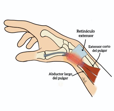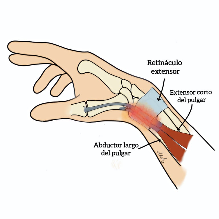 Se produce por la inflamación de los tendones del abductor largo y extensor corto del pulgar a su paso por el primer compartimento extensor de la muñeca, lo que dificulta su deslizamiento normal.